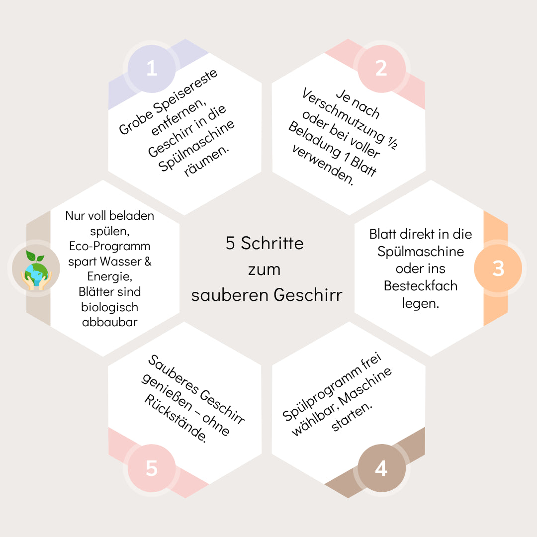 Einfach ein Blatt in die Spülmaschine oder das Besteckfach deiner Spülmaschine legen und den gewohnten Spülgang starten. Geeignet für alle Spülmaschinentypen und Wasserhärtegrade.